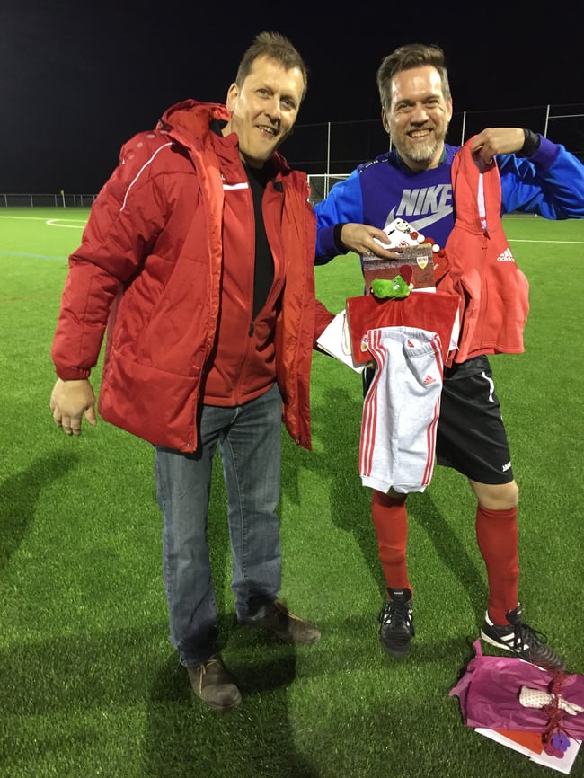 Durch unseren Coach Carlo wurde der Jungvater, für seine hervorragende Leistung zuhause, geehrt! Das Geschenk bestand aus lauter VfB Stuttgart Artikeln. Insider wissen, Torsten ist bekennender Fan des kriselnden Clubs. Ein Dankeschön auch an unseren Seniorenobmann Markus, welcher sich für den Kauf der Kinderkleider verantwortlich zeichnete.
