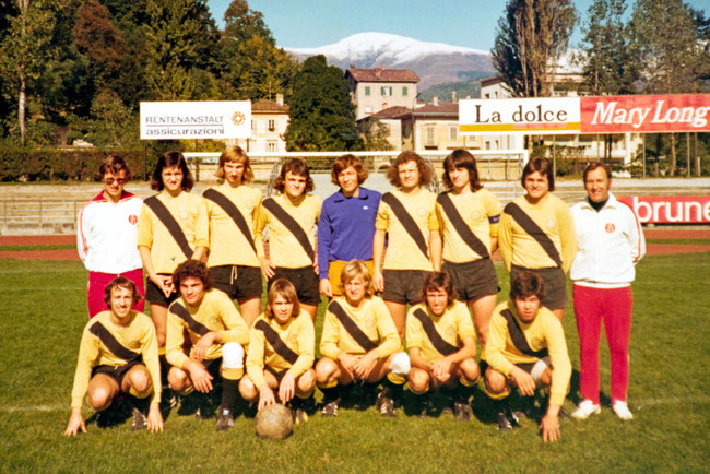 Vor dem Spiel gegen den FC Lugano im Cornaredo-Stadion. Junior Hannes im violetten Trikot als Torhüter (kniend, dritter von links, Heinz Wipf)