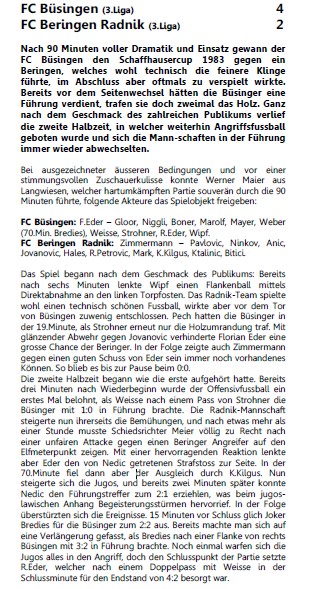 Am Pfingstmontag steigen das Cupfinalspiele des Kanton Schaffhausens - das Fanionteam des FC Büsingen ist dabei mittendrin! Man spielt dabei gegen SV Schaffhausen um die Vorherrschaft im Kanton Schaffhausen. Anpfiff 16:00 auf dem Sportplatz Schweizersbild in Schaffhausen.